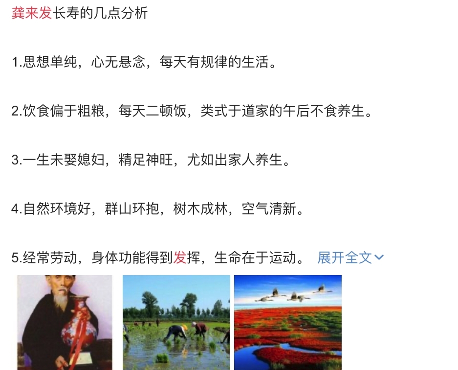 从报道上可以看出,龚来发是1862年出生的,直到1995年3月才去世的,所以他活到133岁,活着的时候被中国老龄委授予“中国长寿之王”的称号。所以这个年龄应该是真实的,毕竟是官方认可过的,主要是因为龚来发活的岁数太大,因此才会引起人们的怀疑,那么龚来发长寿的秘诀是什么?